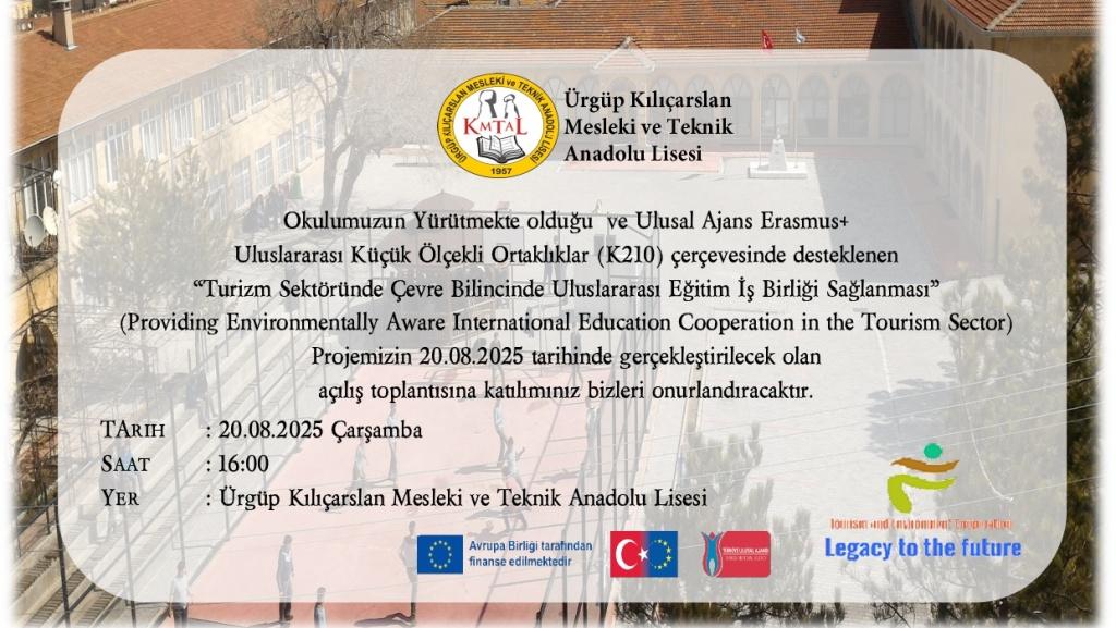 Ürgüp Kılıçarslan Mesleki ve Teknik Anadolu Lisesi olarak , Avrupa Birliği tarafından desteklenen Erasmus+ Programı 2024 Teklif Çağrısı kapsamında sunduğumuz Küçük Ölçekli Ortaklıklar (KA210) projesi olan “Turizm Sektöründe Çevre bilincinde Uluslararası Eğitim İş birliği Sağlanması” ile büyük bir başarıya imza attık. Türkiye genelinde hibe almaya hak kazanan 18 projeden biri olarak hibe olamaya hak kazanan projemizin açılış toplantısına tüm öğretmen, veli, öğrenci ve paydaşlarımız davetlidir.